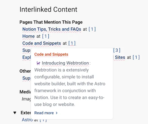 - Pretty looking wikipedia like popups on hover that works with links to any block on any page.